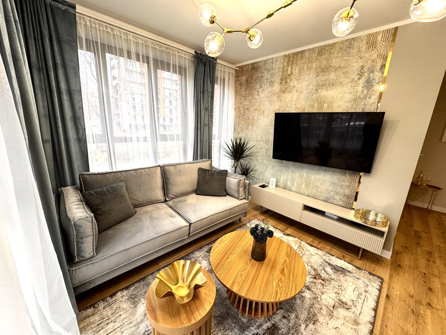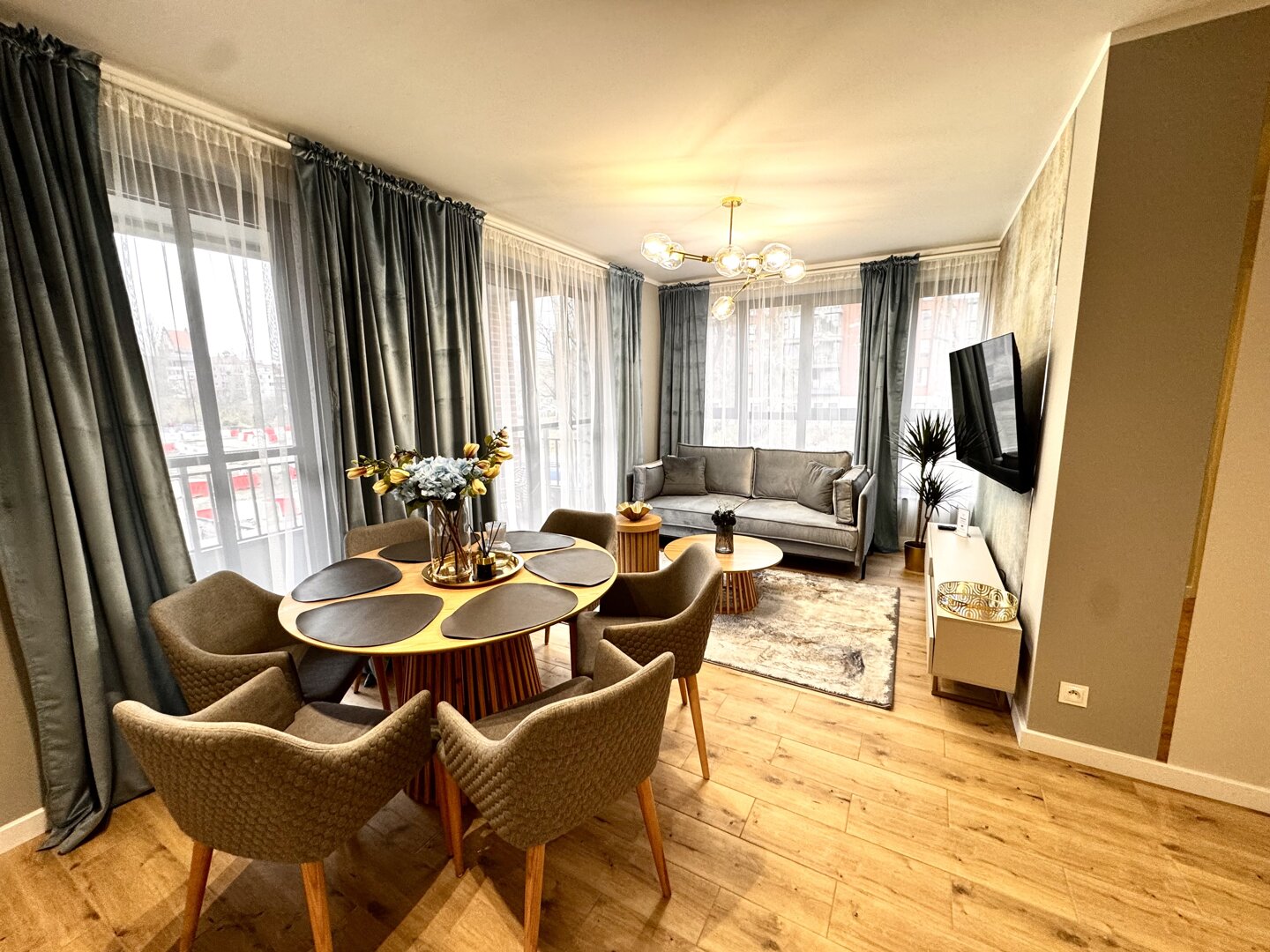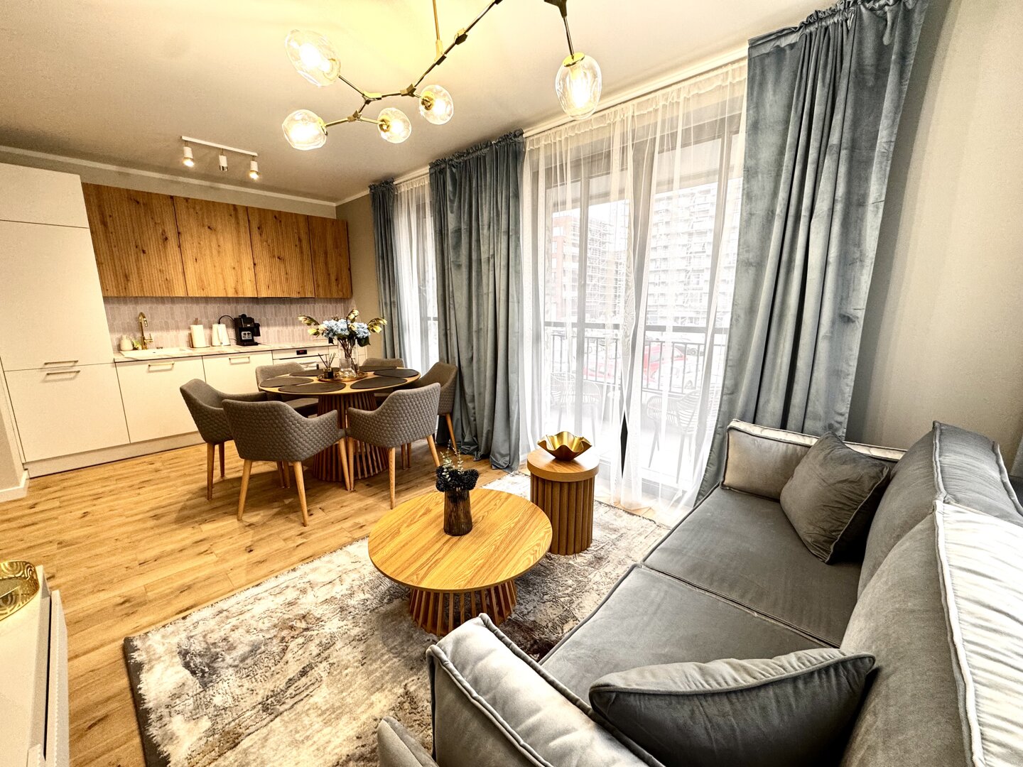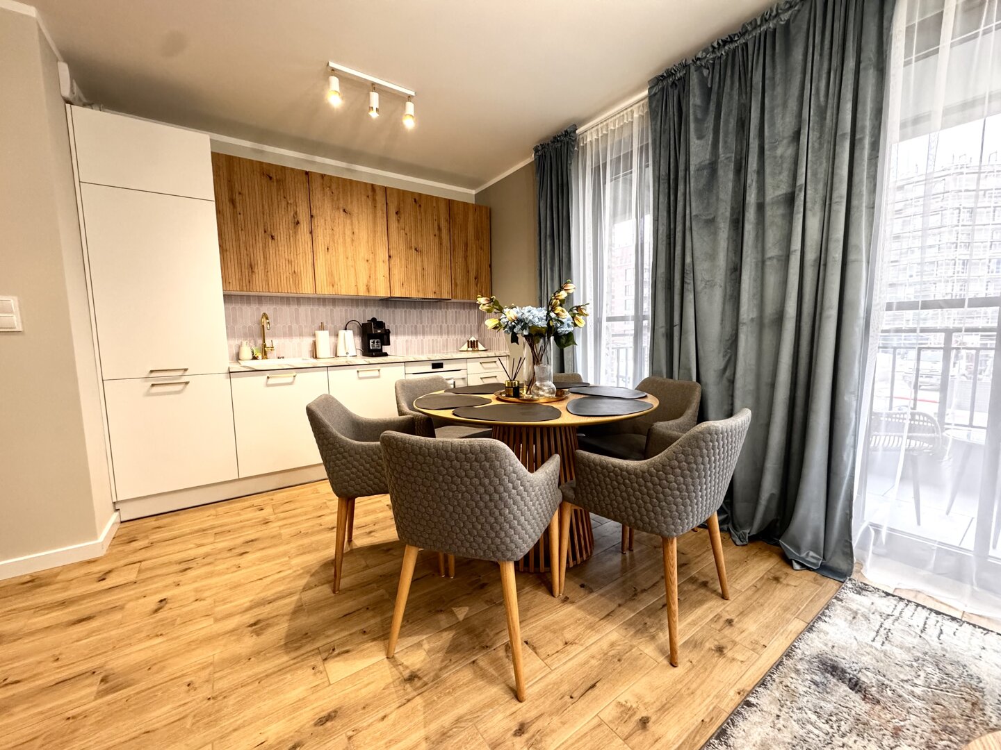 Zapraszamy do wynajęcia wyjątkowego, kompaktowego apartamentu, który spełni oczekiwania nawet najbardziej wymagających gości. Ten elegancki apartament o wysokim standardzie oferuje jasną, otwartą przestrzeń, harmonijnie łączącą salon z aneksem kuchennym.