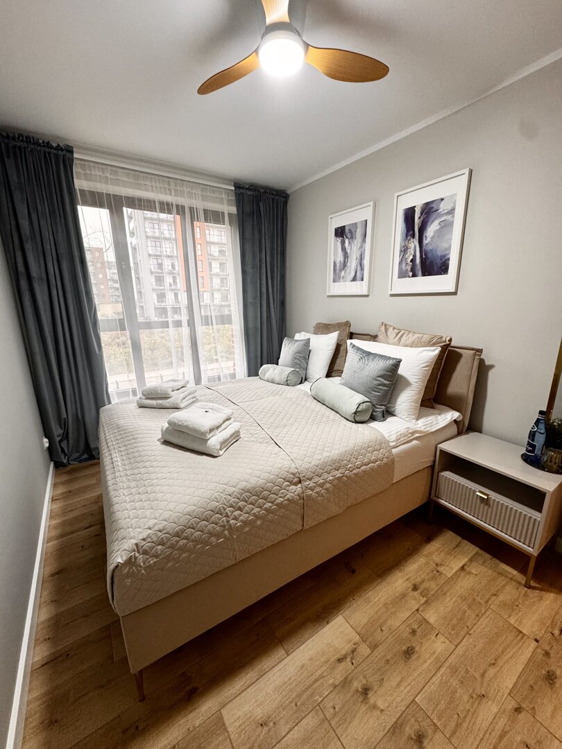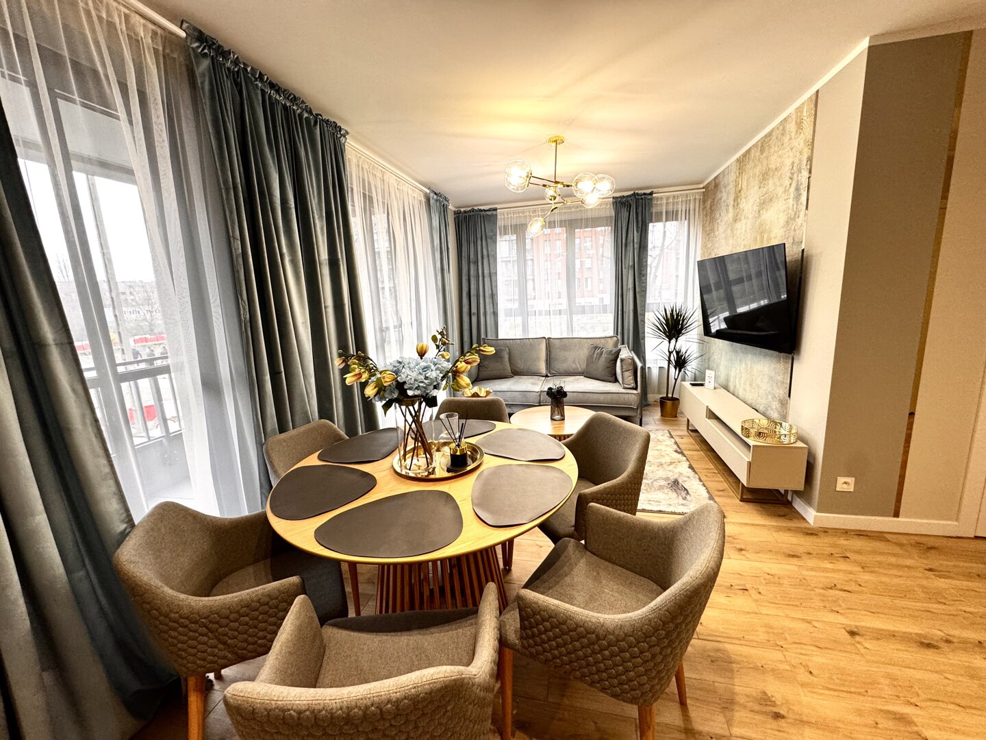 Oferujemy do wynajęcia przestronny i nowoczesny apartament o powierzchni 63 m², idealny dla 4 do 6 osób. Stylowe wnętrze z czarnymi akcentami tworzy elegancką i wyjątkową atmosferę.