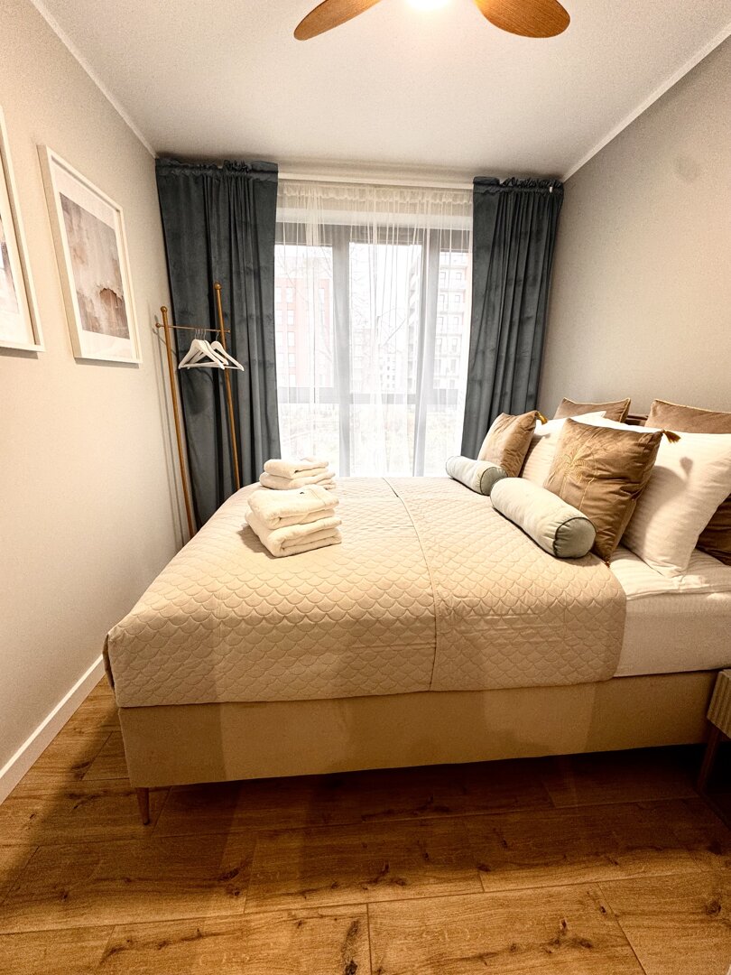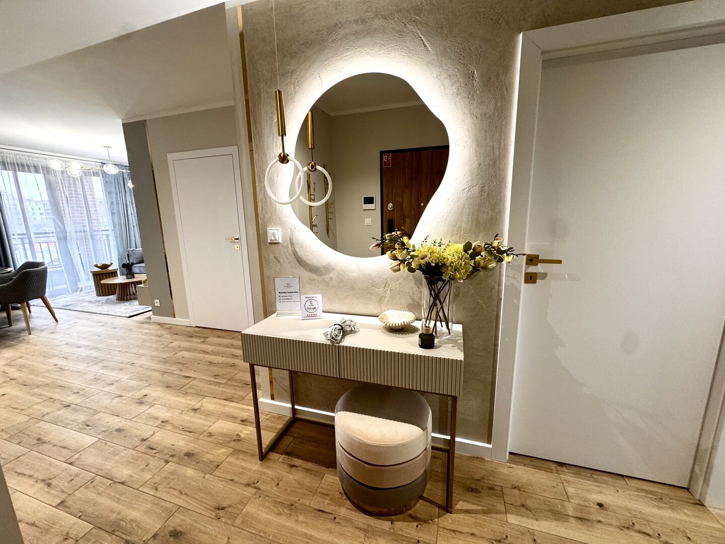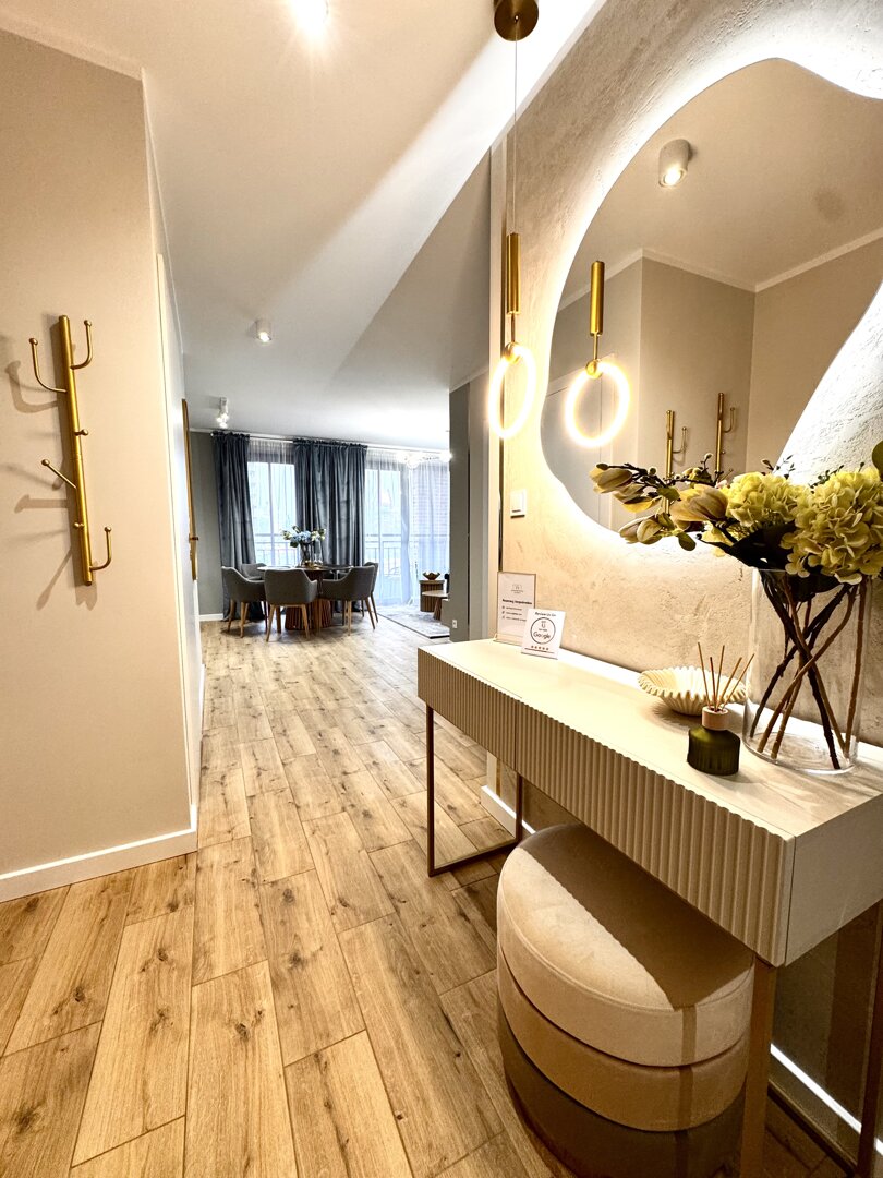 Elegancki i przestronny apartament o powierzchni 67 m², idealny dla 4 do 6 osób. Stylowe wnętrze ze złotymi akcentami zapewnia wyjątkowy klimat.